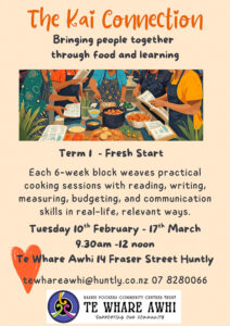 A new community programme, The Kai Connection, is starting this February at Te Whare Awhi, hosted by Raahui Pookeka Community Centres Trust. Running for six weeks from Tuesday 10 February, 9.30am–12 noon, the programme uses food as a way to build